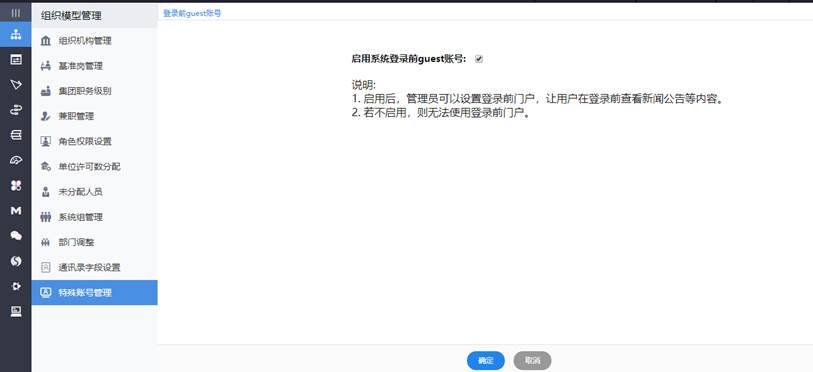 第一步:单位管理员登录后,在【组织模型管理】|【特殊账号管理】中设置启用了登录前guest用户后,才能使用登录前门户。如图所示: