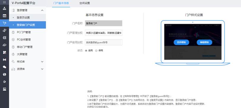 第二步:进入【V-Portal配置平台】|【登录管理】|【登录前门户设置】的【门户基本信息】,可设置门户管理员,门户状态启停用,选择和编辑登录前门户模板,如图所示: