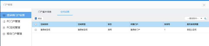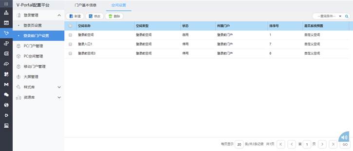 第五步:在【V-Portal配置平台】|【登录管理】|【登录前门户设置】的【空间设置】中管理登录前空间,可新建,删除,修改空间。如下图所示:
