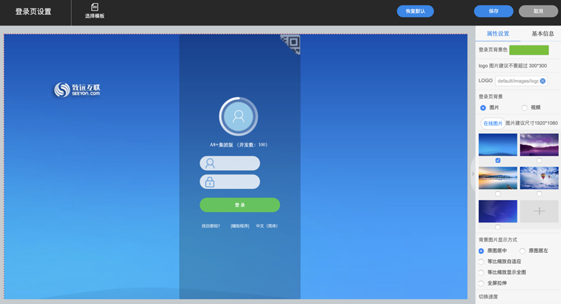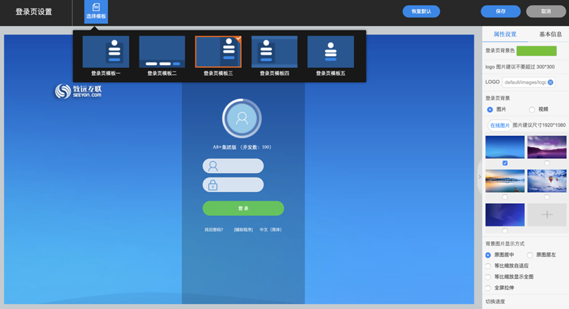 第四步:修改属性设置,可修改登录页背景色、登录页LOGO图片、登录页背景图片、登录页图片显示方式、切换速度、登陆页背景视频(需视频插件支持)