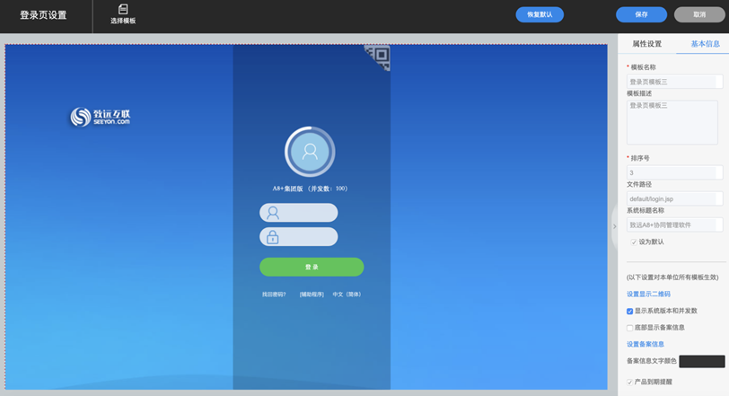 第三步:修改基本信息,如模板名称、模板描述、排序号,文件路径无法修改、系统标题名称、设为默认