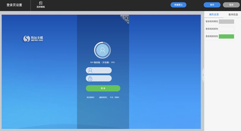 第五步:在设计器预览界面选中登录框后,可以修改登录框的设置项,登录框的是否显示并发数、登录框背景颜色、登录框底部颜色、登录框按钮色等信息