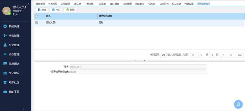 为了记录领导批示数量,并对领导批示进行督办,由文书处对在纸质公文中领导的批示加盖印章并编号。系统中领导处理时,系统自动编号;文书处可直接查询。在公文应用设置可对领导的简称进行设置,如下图: