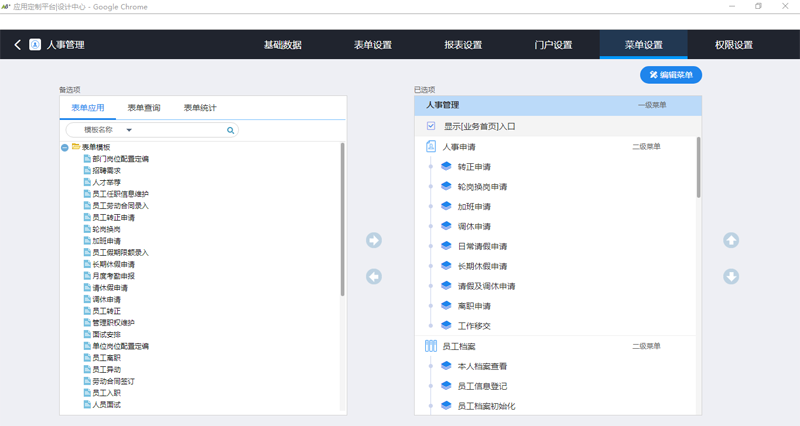 创建应用菜单,菜单中可以保存跨应用的表单模板、表单查询、统计报表和业务空间以及系统文档中心、文化建设、HR管理和组织模型中的内容。菜单中可以设置一级菜单以及各级菜单的显示图标(点击图标即可上传相关图片文件);勾选“显示业务首页入口”则在菜单中可快速进入业务空间首页。