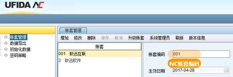 账套编码:从NC系统获取,NC5、NC6系列获取方式不同,一下会对2个版本分别截图说明;