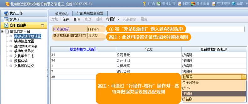 外部系统编码:输入NC系统“应用集成-外部系统信息设置”的“外系统编码”。如此处尚未设置,请先设置再进行A8+账套配置。表头“默认基础数据匹配规则”为所有数据总规则,如果个例可在表体设置。