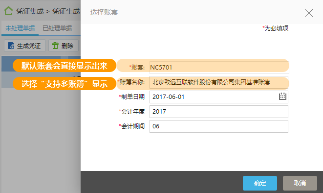 *是否支持多账套:不选时,凭证生成不显示账簿名称;NC集成必选。