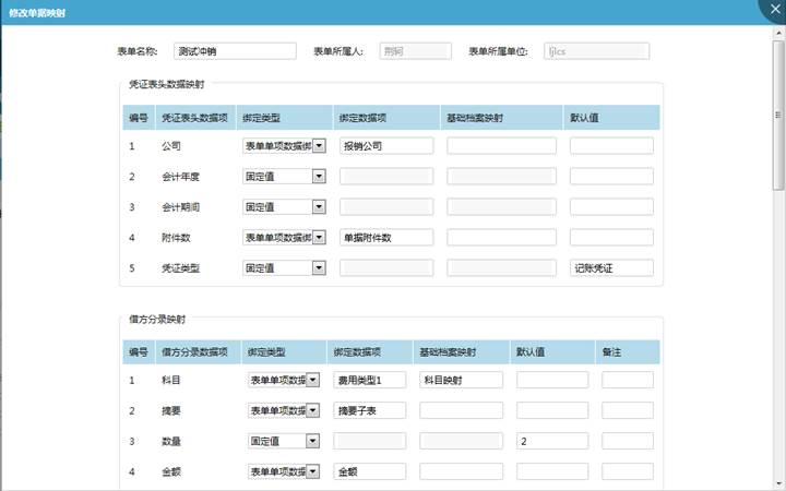 特殊说明:①“凭证表头映射”设置凭证表头与OA表单数据项的对应和转换关系。凭证表头只能从OA主表数据项绑定。凭证类型默认值填写EAS对应凭证类型名称;