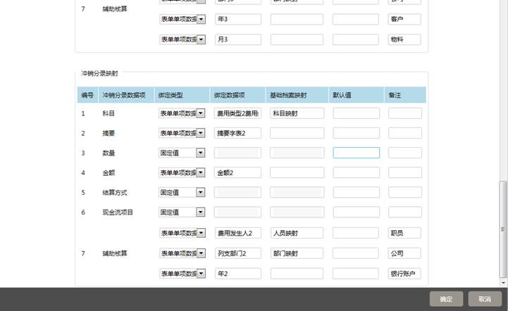 ⑤“冲销分录映射”设置凭证冲销分录与OA表单数据项的对应和转换关系。冲销分录可以与同一OA重复表和主表绑定,不能跨重复表绑定。
