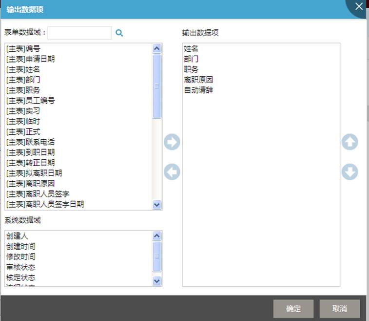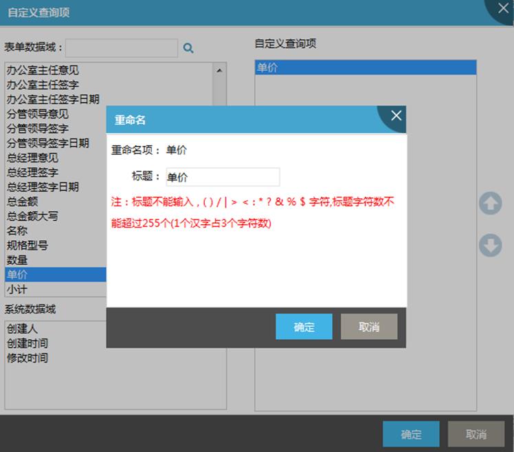 第六步(可选):设置自定义查询项。在表单查询处出现自定义查询模式,用户可以自定义条件组合查询。单击自定义查询项右边的【设置】,在弹出的对话框中,将要在自定义查询模式下的查询条件中显示出来的数据项从左边选至右边,双击查询数据域内的某项标题可以修改标题名称。如图所示: