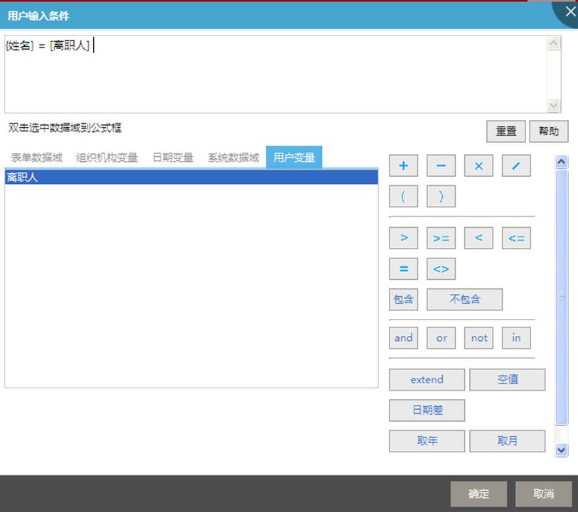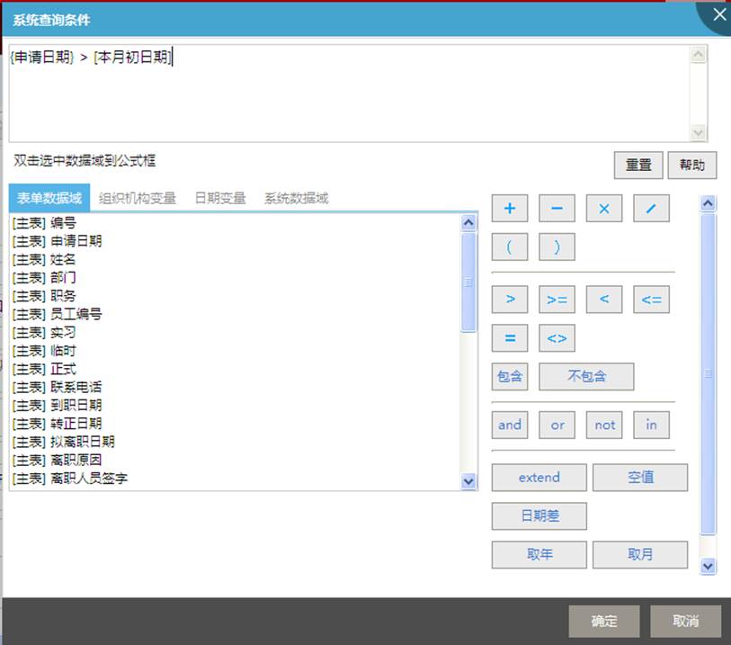 第四步(可选):单击系统查询条件右边的【设置】,弹出查询数据范围对话框。通过单击表单数据域、系统数据域或系统变量,并借助算术运算符、条件运算符和逻辑运算符、以及扩展控件选取函数extend,组成所要的查询条件;也可设置表单数据域、系统数据域或系统变量的模糊查询:包含,不包含,如图系统查询条件设置。系统数据域支持创建人、创建时间、修改时间、单据状态、流程状态。如图所示: