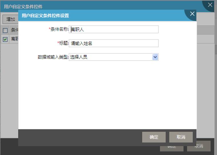 第五步(可选):单击用户输入条件右边的【条件控件】,弹出用户输入条件对话框,单击【增加】,在弹出的参数设置对话框中,输入条件名称、相对应的显示标题、缺省值,以及条件值的输入类型,确定后退出参数设置对话框。如图所示:用户输入参数设置;