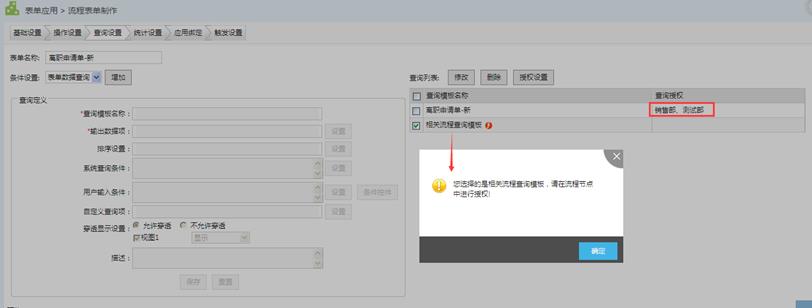 “表单数据查询”和“相关流程查询“模板保存后,在查询列表中显示,表单数据查询的模板勾选可修改、删除、授权。相关流程查询的模板在标题后增加“F”图标,勾选可修改,删除,不可进行授权设置,点击“授权设置”提示“您选择的是相关流程查询模板,请在流程节点中进行授权。”如图所示。