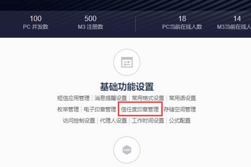 完成电子签章插件配置后,以单位管理员身份登录协同系统,在基础功能设置的【信任度印章管理】里,进行印章授权。如下图
