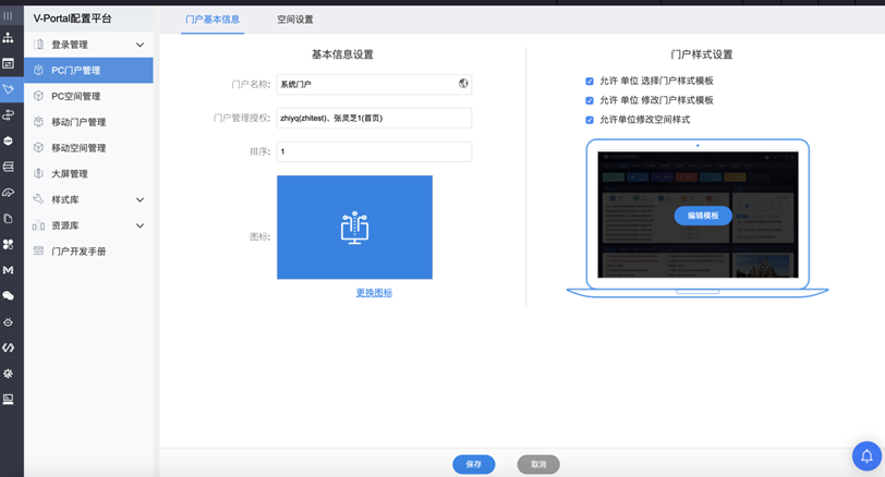 第一步:点击【V-Portal配置平台】|【pc门户管理】进入pc门户列表,选择一个门户点击查看进入门户基本信息的门户样式设置中,有编辑模版功能按钮,可设置是否允许单位自定义门户信息;在基本信息设置中可修改门户名称,排序号和图标。如图所示: