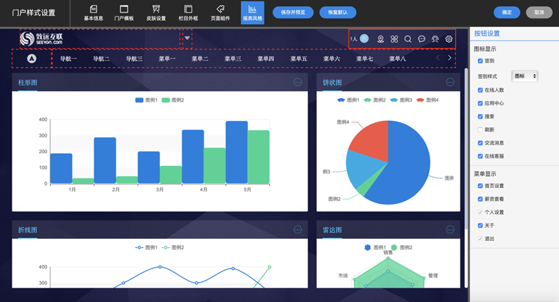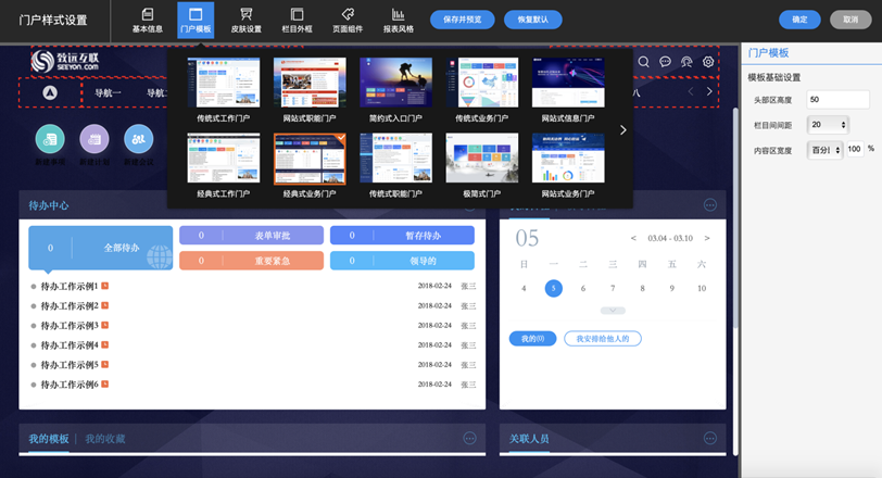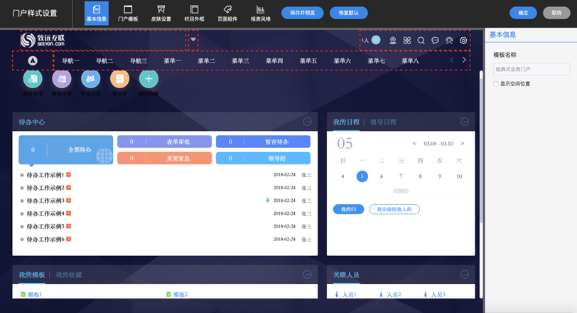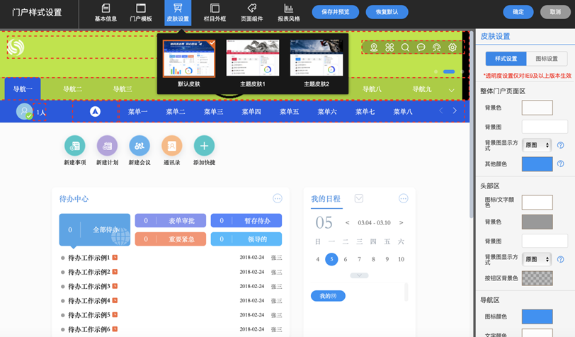 第二步:皮肤设置,点击【编辑模板】|【皮肤设置】修改热点配置,可进行整体门户页面区、头部区、导航区、栏目内容区的配置,支持管理员可选择多种门户皮肤。