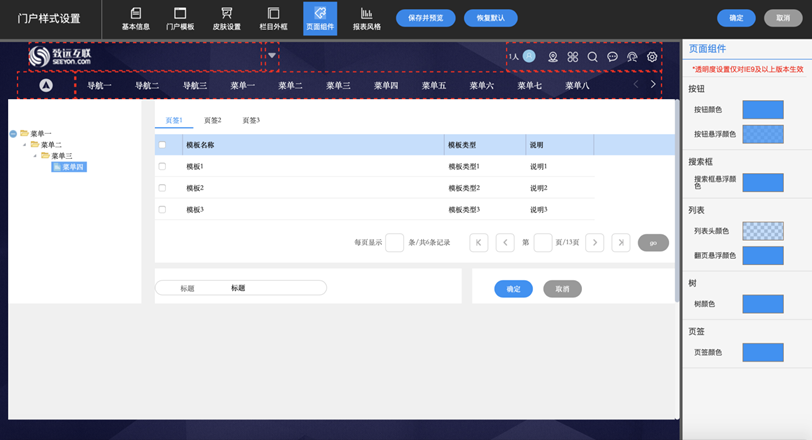 第六步:页面组件,点击【编辑模板】|【页面组件】修改热点配置,可修改按钮,搜索框,列表,树,页签的设置。