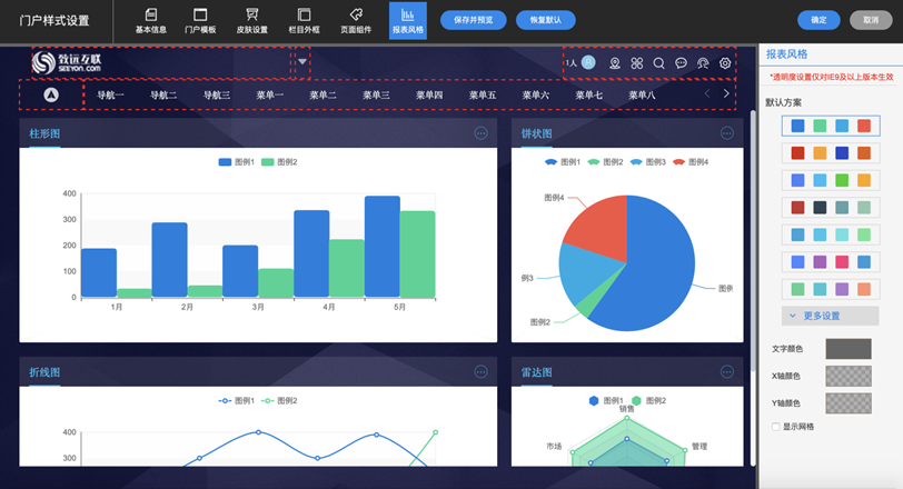 第七步:报表风格,点击【编辑模板】|【报表风格】修改热点配置,可修改默认方案,文字颜色,轴线颜色,是否显示网格线的设置。