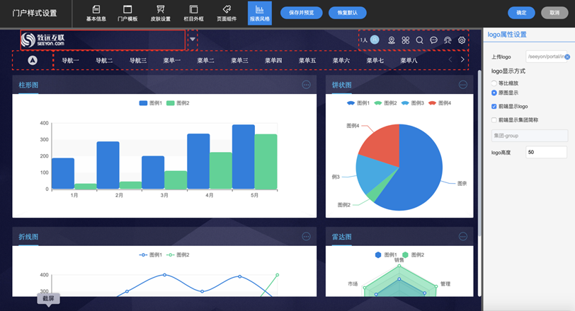 第八步:点击设计器预览界面的logo图片区域,在logo属性设置界面,可对logo图片,logo显示方式,是否前端显示logo,是否前端显示集团简称,logo高度进行设置