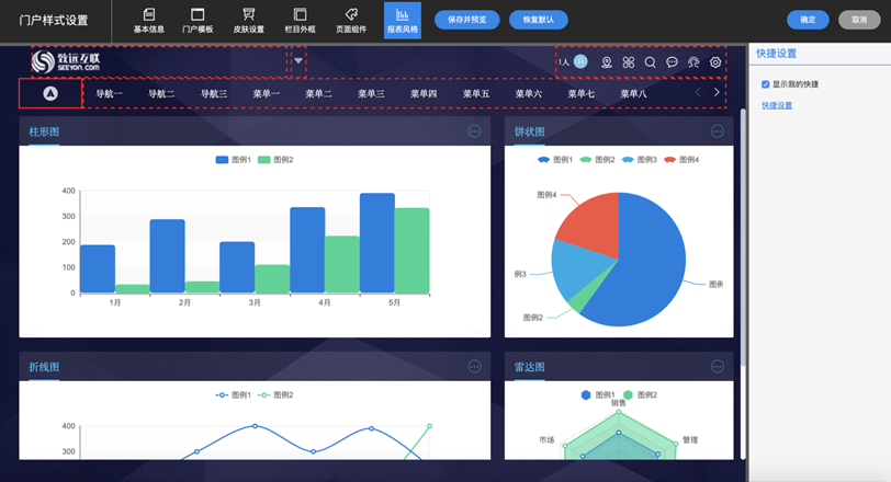 第十步:点击设计器预览界面的快捷设置区域,在快捷设置界面可选择是否显示我的快捷并进行快捷设置。