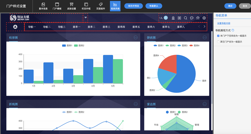 第十一步:点击设计器预览界面的导航菜单区域,可设置导航内容,选择是否本门户下空间合为一组显示,选择是否其他门户合为一组显示。PC子门户支持管理员设置菜单是否展开。