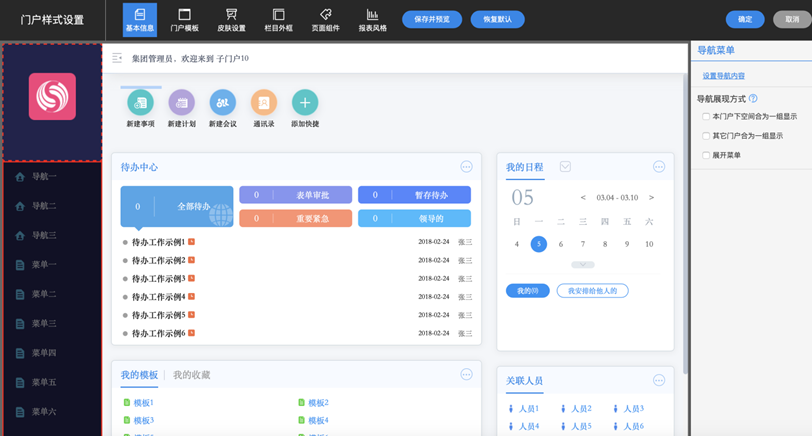 n 操作说明:设置集团下人员系统首页的样式,系统提供8套门户模板供用户选择。