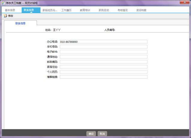 n 操作步骤:点击一级菜单【HR管理】,选择【员工档案管理】,选择一条记录单击,进入员工基本信息界面,点击页签【联系信息】,进入联系信息的界面。如下图所示:
